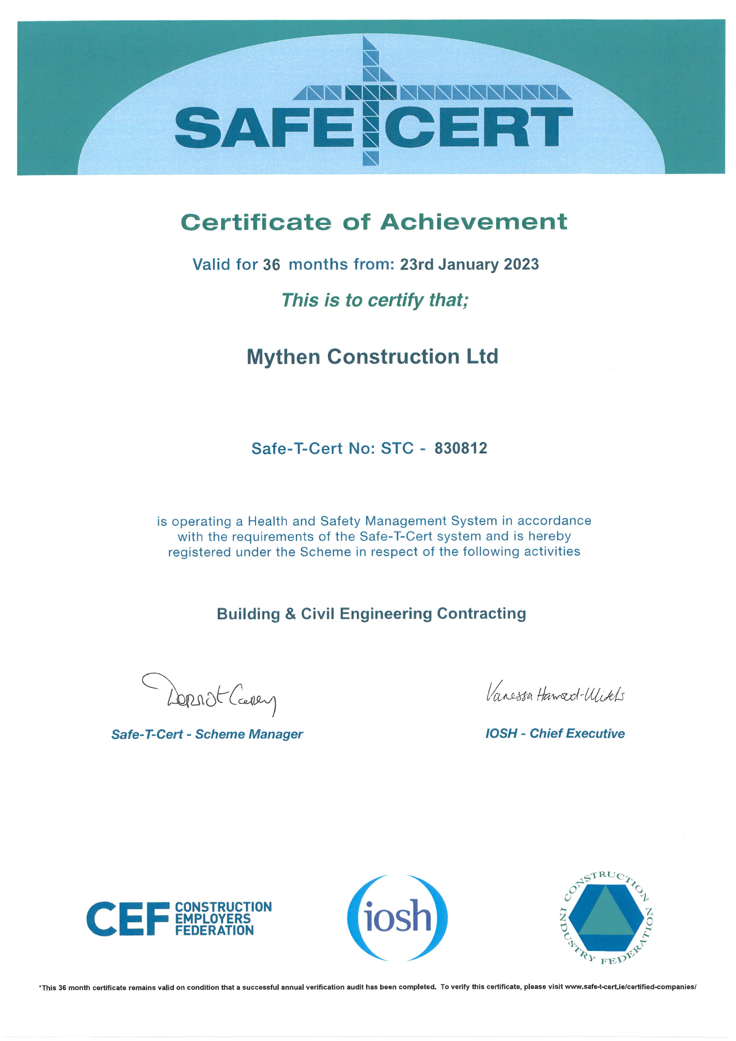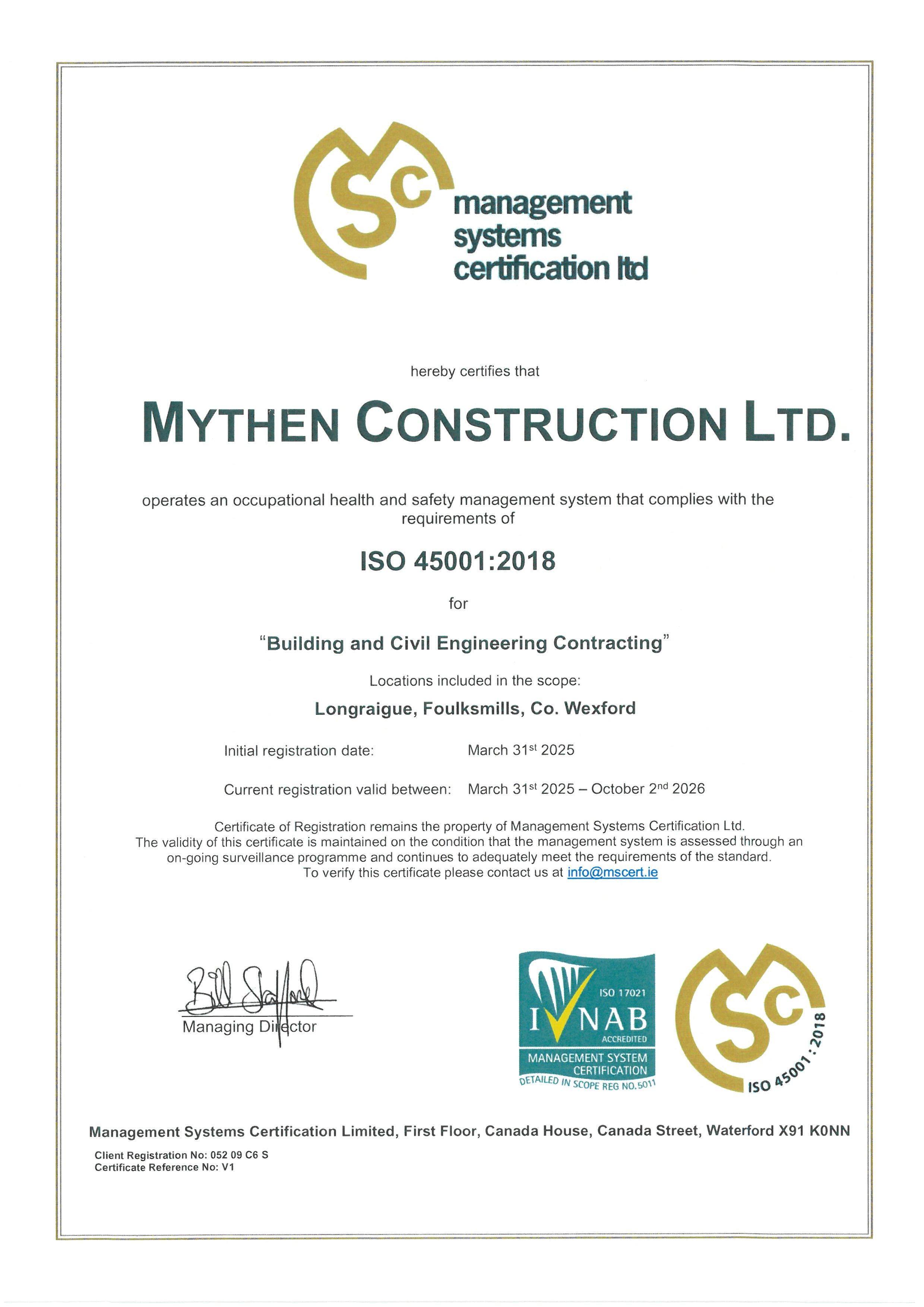Mythen Construction has an exceptional safety record and this has been verified by achieving certification through the Safe-T-Cert scheme since 2008 and ISO 45001 : 2018 since 2025. This means that Mythen Construction Ltd. has a certified health and safety management system based on the requirements of National and European legislation.